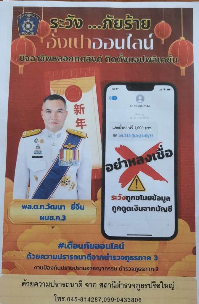 ร.ต.อ.จรัญ อุตสาหะ รอง สวป.(ชส.) สภ.ปรือใหญ่ พร้อมด้วยชุดชุมชนมวลชนสัมพันธ์ สภ.ปรือใหญ่ ออกตรวจเยี่ยมพบปะประชาชน บ้านปรือใหญ่ และได้ประชาสัมพันธ์เตือนภัยระวัง! ภัยร้าย อั่งเปาออนไลน์มิจฉาชีพหลอกกดลิงค์ติดตั้งแอปพลิเคชั่น ให้กับเจ้าหน้าที่ รพ.สต.ปรือใหญ่ ต.ปรือใหญ่ อ.ขุขันธ์ จ.ศรีสะเกษ