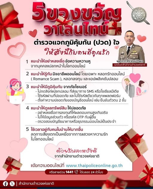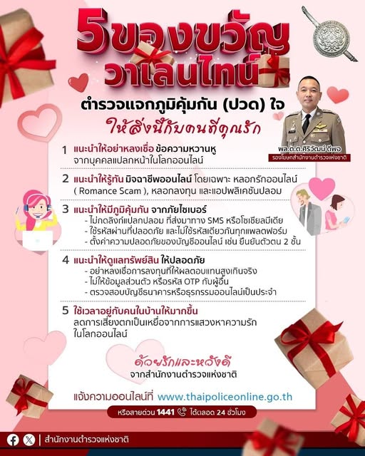 สำนักงานตำรวจแห่งชาติ จึงขอใช้โอกาสนี้ แนะนำพี่น้องประชาชน ที่ไม่ต้องการเจ็บปวดใจให้กับความรักที่ไม่สมหวัง ให้หันมาแสดงความรักกับคนในครอบครัว ด้วยการสร้างภูมิคุ้มกันภัยอาชญากรรมทางเทคโนโลยี ซึ่งเป็นภัยคุกคามสำคัญที่สร้างความเสียหายให้กับพี่น้องประขาชนจำนวนมาก โดย สำนักงานตำรวจแห่งชาติ ขอแนะนำ ดังนี้